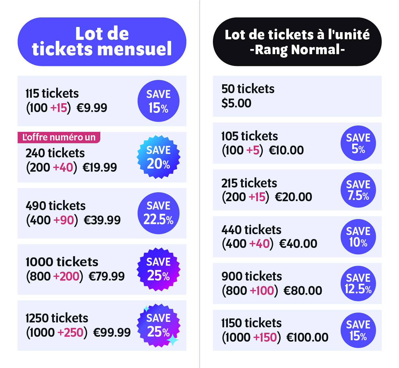 Par exemple, pour un Rang Normal, vous pouvez économiser jusqu'à 5% sur vos lots de tickets à l'unité (jusqu'à 5% de tickets bonus).